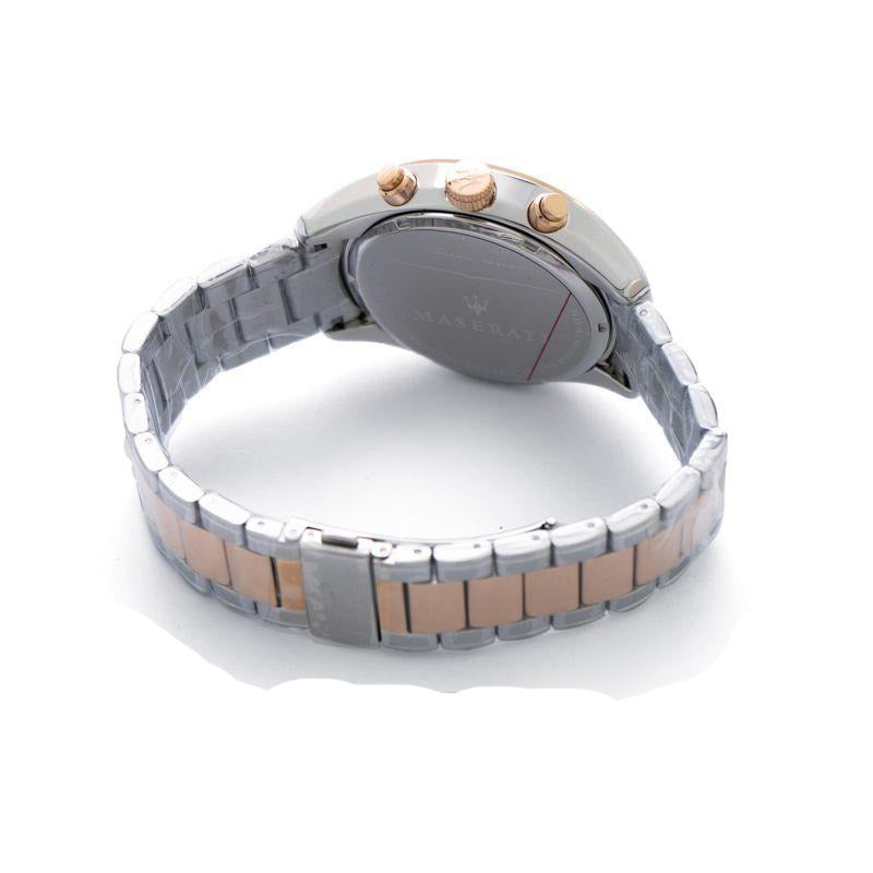علبة من الفولاذ المقاوم للصدأ بلون فضي مع سوار من الفولاذ المقاوم للصدأ بلونين (فضي وذهبي وردي). إطار ثابت من الفولاذ المقاوم للصدأ بلون ذهبي وردي. مينا بني مع عقارب ومؤشرات ساعات بلون ذهبي وردي. مؤشرات دقائق حول الحافة الخارجية. نوع المينا: تناظري. عقارب مضيئة. كرونوغراف - ثلاثة موانئ فرعية تعرض: 60 ثانية، 60 دقيقة، و24 ساعة. حركة كوارتز من عيار ميوتا JS50-00C. زجاج معدني مقاوم للخدش. تاج لولبي. غطاء خلفي صلب. شكل العلبة: دائري، حجم العلبة: 45 مم، سمك العلبة: 12 مم. مقاومة للماء حتى عمق 100 متر / 330 قدم. الوظائف: كرونوغراف، ساعة، دقيقة، ثانية. تصميم ساعة كاجوال. علامة الساعة: حركة يابانية. ساعة مازيراتي تراجواردو كرونوغراف بمينا بني للرجال R8873612003.