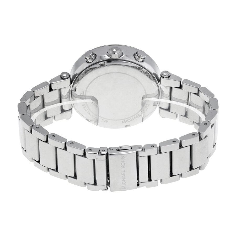 علبة وسوار من الفولاذ المقاوم للصدأ. إطار ثابت فضي اللون مرصع بكريستالات الزركون. مينا أزرق داكن مع عقارب فضية مضيئة ومؤشرات ساعات كريستالية. يظهر رقم عربي عند الساعة 12. مؤشرات دقائق حول الحافة الخارجية. نوع المينا: تناظري. عقارب مضيئة. عرض التاريخ بين الساعة 4 و5. كرونوغراف - ثلاثة موانئ فرعية تعرض: 60 ثانية، 60 دقيقة، و24 ساعة. حركة كوارتز. زجاج معدني مقاوم للخدش. تاج سحب/دفع. غطاء خلفي صلب. قطر العلبة: 39 مم. شكل العلبة: دائري. عرض السوار: 20 مم. مشبك قابل للطي. مقاومة للماء حتى عمق 100 متر/330 قدم. الوظائف: كرونوغراف، تاريخ، ساعة، دقيقة، ثانية. تصميم ساعة كاجوال. ساعة مايكل كورس باركر كرونوغراف نسائية من الفولاذ المقاوم للصدأ بمينا أزرق داكن MK6117.