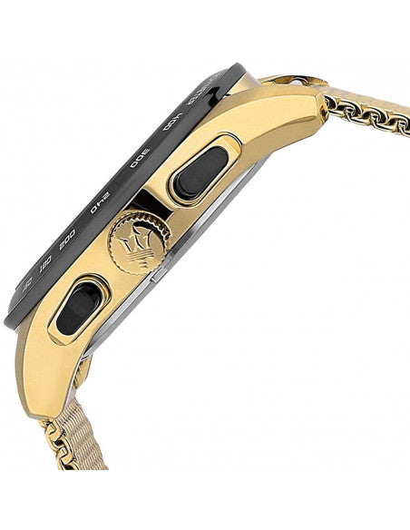 علبة من الفولاذ المقاوم للصدأ بلون ذهبي مع سوار ميلانو شبكي من الفولاذ المقاوم للصدأ بلون ذهبي. مثبتة بإطار تاكيمتر محفور من الفولاذ المقاوم للصدأ الأسود. مينا أسود مع عقارب ذهبية اللون وأرقام عربية ومؤشرات للساعات. مؤشرات دقائق حول الحافة الخارجية. نوع المينا: تناظري. عقارب ومؤشرات مضيئة. كرونوغراف - ثلاثة موانئ فرعية تعرض: 60 ثانية، 30 دقيقة، و24 ساعة. حركة كوارتز من عيار ميوتا JS50. زجاج معدني مقاوم للخدش. تاج لولبي. غطاء خلفي صلب. شكل العلبة: دائري، حجم العلبة: 45 مم، سمك العلبة: 13 مم. عرض السوار: 22 مم. مشبك ميلانو. مقاومة للماء حتى عمق 100 متر / 330 قدم. الوظائف: كرونوغراف، توقيت غرينتش، منطقة زمنية ثانية، ساعة، دقيقة، ثانية. تصميم ساعة كاجوال. صنع في اليابان. ساعة مازيراتي تراجواردو كرونوغراف كوارتز بمينا أسود للرجال R8873612010.
