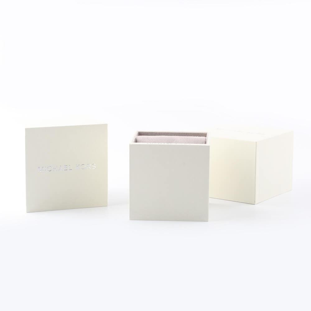ساعة مايكل كورس MK4689 إيمري النسائية، بعلبة مستطيلة من الفولاذ المقاوم للصدأ بلون الذهب الوردي بقطر 33 مم، ومينا أبيض، وسوار أحمر. تعمل الساعة بحركة كوارتز.