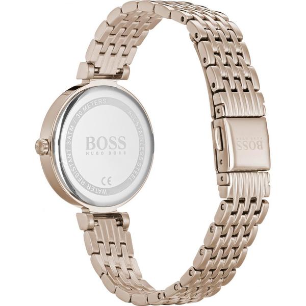 Hugo Boss Off White Dial Acero inoxidable Ladies Watch 1502480, con una esfera Off White con correa de acero inoxidable. El reloj se abrocha con una correa de cuero negro.