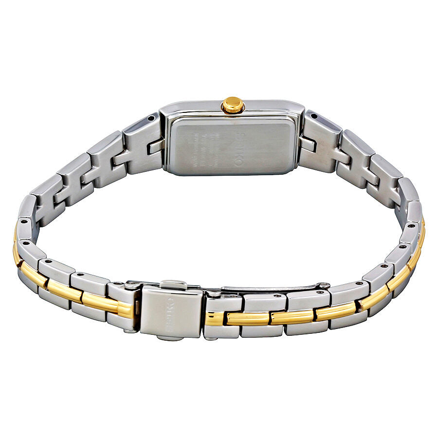 Caja de acero inoxidable con brazalete de acero inoxidable en dos tonos (plata y oro amarillo). Bisel fijo en tono oro amarillo. Esfera negra con manecillas doradas amarillas y marcadores de hora índice. Tipo de esfera: analógica. Movimiento de cuarzo. Cristal Hardlex resistente a los arañazos. Tirar/empujar la corona. Parte trasera sólida. Tamaño de la caja: 15 mm. Grosor de la caja: 6 mm. Forma de caja rectangular. Ancho de banda: 7 mm. Cierre plegable con botón de liberación. Resistente al agua a 30 metros / 100 pies. Funciones: hora, minuto. Información adicional: alimentado por energía lumínica - reserva de marcha de 12 meses. Estilo de reloj informal. Reloj Seiko para dama bicolor con esfera negra SUP274.