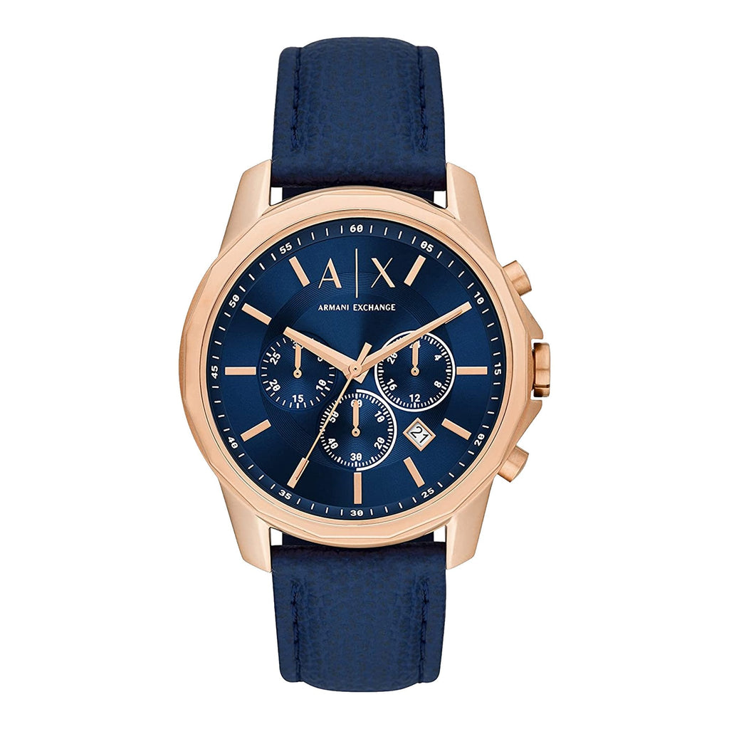 Caja de acero inoxidable en tono oro rosa con correa de piel azul. Bisel fijo en tono oro rosa. Esfera azul con manecillas en tono oro rosa y marcadores de hora índice. Marcadores de minutos en números arábigos (a intervalos de 5 minutos). Marcadores de minutos alrededor del borde exterior. Tipo de esfera: analógica. Visualización de la fecha entre las posiciones de las 4 y las 5 en punto. Cronógrafo: tres subesferas que muestran: 60 segundos, 30 minutos y 24 horas. Movimiento de cuarzo. Cristal mineral resistente a los arañazos. Tirar/empujar la corona. Parte trasera sólida. Forma de caja redonda. Tamaño de la caja: 44 mm. Grosor de la caja: 11 mm. Ancho de banda: 22 mm. Cierre de espiga. Resistente al agua a 50 metros / 165 pies. Funciones: cronógrafo, fecha, hora, minuto, segundo. Serie Bancos. Estilo de reloj informal. Armani Exchange Banks Reloj cronógrafo de cuarzo con esfera azul para hombre AX1723.