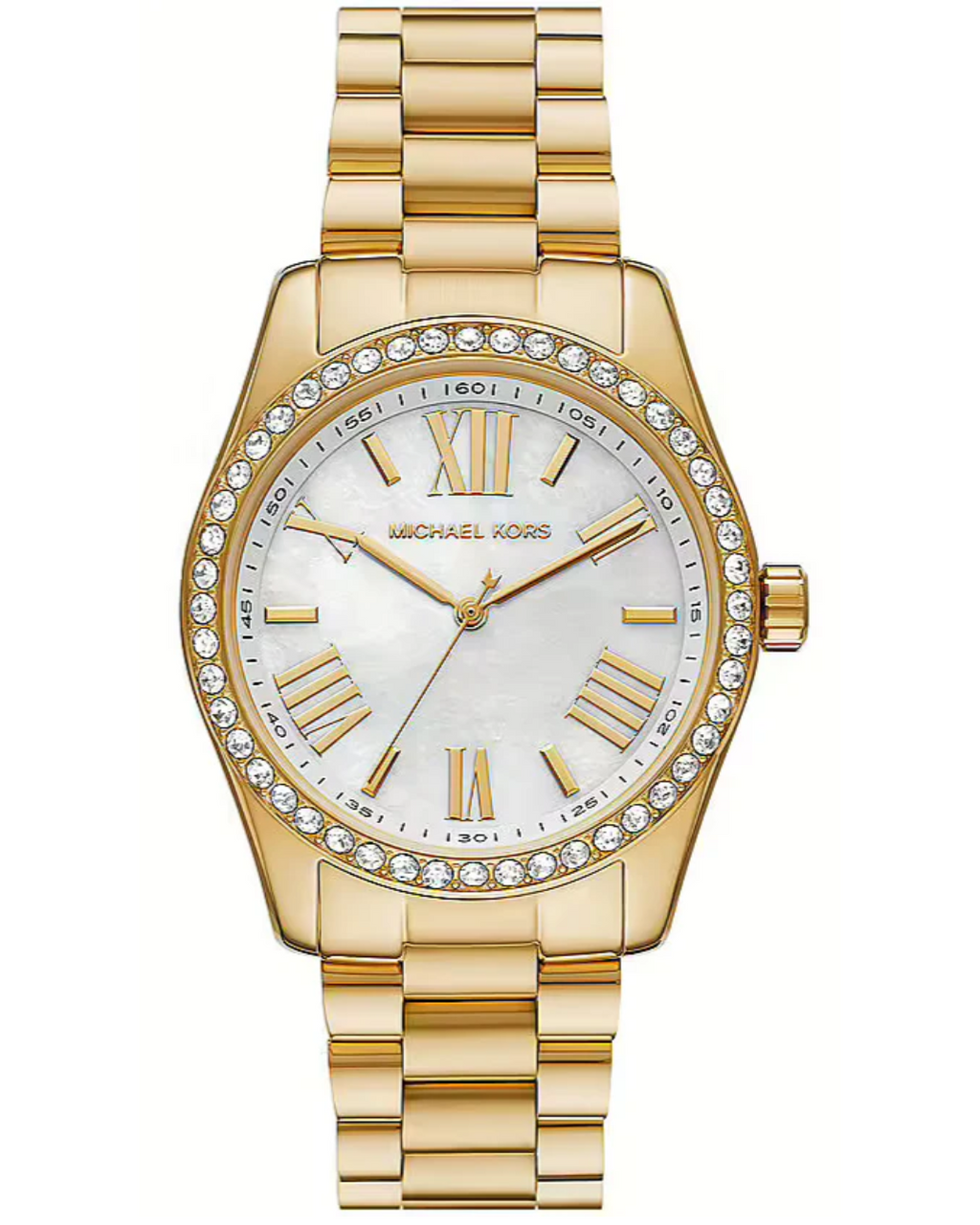 This elegant and sophisticated Women Lexington Quartz Watch 38mm is the perfect accessory for the modern woman. With its precise quartz movement and 38mm case, it exudes luxury and style. The perfect combination of form and function, this watch will elevate any outfit and add a touch of class to your wardrobe. Michael Kors Watch women's watch from the Lexington collection. Watch with quartz movement / 3 hands and 10 ATM water resistance. The round-shaped case has a diameter of 38 MM, is made of stainless steel with a polished finish and is gold in color with crystals on the bezel. The dial is white with transparent glass. The strap is a stainless steel bracelet type with mixed finish and is gold in color. The clasp is of the deployant type