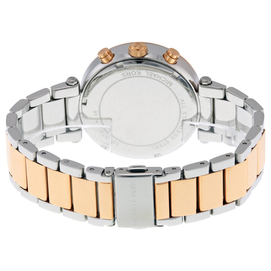 Caja de acero inoxidable en tono oro rosa con brazalete de acero inoxidable en dos tonos (plata y oro rosa). Bisel fijo en tono oro rosa engastado con cristales. Esfera azul con manecillas luminosas en tono oro rosa y marcadores de hora índice de cristal. Un número arábigo marca la posición de las 12 en punto. Marcadores de minutos alrededor del borde exterior. Tipo de esfera: analógica. Visualización de la fecha entre las posiciones de las 4 y las 5 en punto. Cronógrafo: tres subesferas que muestran: 60 segundos, 30 minutos y 24 horas. Movimiento de cuarzo. Cristal mineral resistente a los arañazos. Tirar/empujar la corona. Parte trasera sólida. Diámetro de la caja: 39 mm. Grosor de la caja: 11 mm. Forma de caja redonda. Ancho de banda: 20 mm. Cierre desplegable. Resistente al agua a 50 metros / 165 pies. Funciones: fecha, día, hora, minuto, segundo, 24 horas. Estilo de reloj informal. Michael Kors Parker Reloj cronógrafo para mujer con esfera azul y dos tonos MK6141.