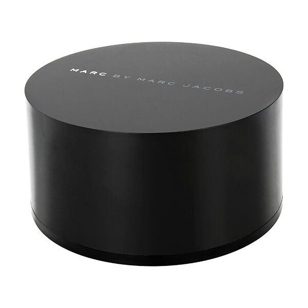 Rose gold-plated stainless steel case with a black leather strap. Fixed rose gold-plated bezel. Black dial with silver-tone hands and dot hour markers. Arabic numerals mark the 3, 6, 9 and 12 o'clock positions. Dial Type: Analog. Quartz movement. Scratch resistant mineral crystal. Pull / push crown. Solid case back. Case diameter: 36 mm. Case thickness: 12 mm. Round case shape. Band width: 20 mm. Band length: 6 inches. Tang clasp. Water resistant at 50 meters / 165 feet. Functions: hour, minute, second. Casual watch style. Marc by Marc Jacobs Black Dial Black Leather Ladies Watch MBM1225.