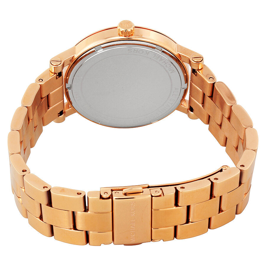 Rose gold-tone stainless steel case and bracelet. Fixed rose gold-tone bezel. Rose dial with rose gold-tone hands and Roman numeral hour markers. Dial Type: Analog. Quartz movement. Scratch resistant mineral crystal. Pull / push crown. Solid case back. Case size: 38 mm. Case thickness: 8 mm. Round case shape. Band width: 18 mm. Deployment with push button release clasp. Water resistant at 100 meters / 330 feet. Functions: hour, minute, second. Dress watch style. Michael Kors Norie Rose Dial Ladies Watch MK3561.