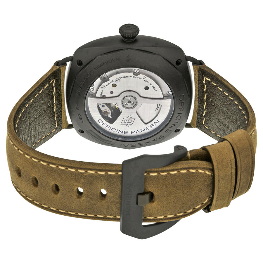 Black composite ceramic case with a brown leather strap. Fixed black ceramic bezel. Brown dial with luminous hands and index hour markers. Arabic numerals mark the 6, 9 and 12 o'clock positions. Dial Type: Analog. Luminescent hands and markers. Date display at the 3 o'clock position. Small seconds sub-dial at th e9 o'clock position subdials. Panerai Calibre P.9000 Automatic movement, containing 28 Jewels, composed of 197 parts, bitting at 28800 vph, and has a power reserve of approximately 72 hours. Scratch resistant sapphire crystal. Screw down crown. See through case back. Cushion case shape. Case size: 45 mm. Tang clasp. Water resistant at 100 meters / 330 feet. Functions: date, hour, minute, small second. Luxury watch style. Watch label: Swiss Made. Panerai Radiomir Composite Black Seal 3 Days Automatic Men's Watch PAM00505.