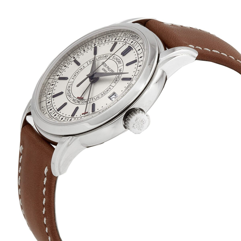 Silver-tone stainless steel case with a brown (hand stitched calfskin) leather strap. Fixed silver-tone stainless steel bezel. Silvery opaline dial with silver-tone hands and index hour markers. Week markers. Days of the week. Month markers around the outer rim. Dial Type: Analog. Date display at the 3 o'clock position. Patek Philippe Calibre 26-330 S C J SE Automatic movement, containing 50 Jewels, composed of 304 parts, bitting at 28800 vph, and has a power reserve of approximately 45 hours. Scratch resistant sapphire crystal. Screw down crown. Transparent case back. Round case shape, case size: 40 mm, case thickness: 10.79 mm. Pin buckle clasp. Water resistant at 30 meters / 100 feet. Functions: month, date, day, hour, minute, second, weekly calendar. Calatrava Series. Luxury watch style. Watch label: Swiss Made. Patek Philippe Calatrava Automatic Weekly Calendar Men's Watch 5212A-001.