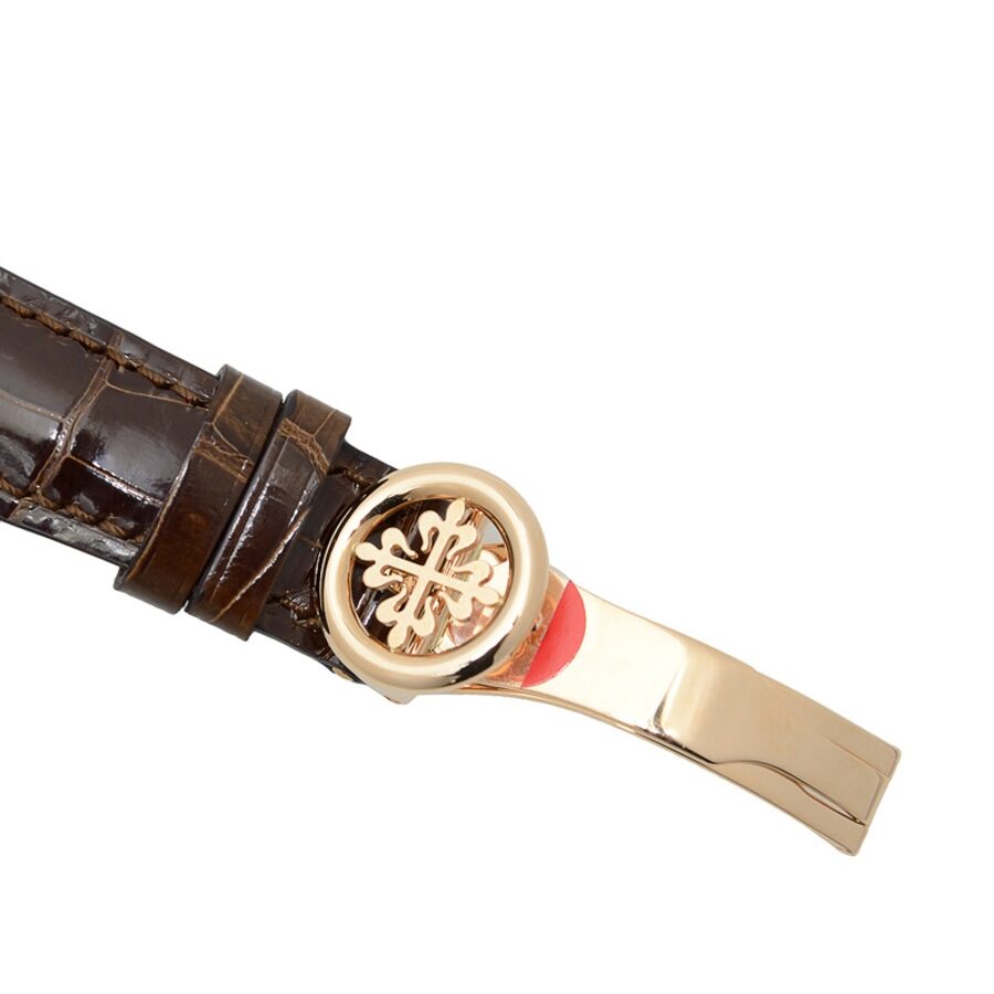 18kt rose gold case with a brown alligator leather strap. Fixed 18kt rose gold bezel. Silvery opaline dial with rose gold-tone hands and index hour markers. Minute markers around the outer rim. Dial Type: Analog. Annual calendar. One subdial displaying: 24 hour/moonphase. Patek Philippe Calibre 324 S QA LU 24H/303 Automatic movement, containing 34 Jewels, composed of 347 parts, bitting at 28800 vph, and has a power reserve of approximately 45 hours. Scratch resistant sapphire crystal. Transparent case back. Round case shape, case size: 38.5 mm, case thickness: 11.2 mm. Tang clasp. Water resistant at 30 meters / 100 feet. Functions: annual calendar, moon phase, month, date, day, GMT, second time zone, hour, minute, second. Annual Calendar Series. Luxury watch style. Watch label: Swiss Made. Item Variations: 5396R 011, 5396R.011, 5396R011. Patek Philippe Complications Annual Calendal 18kt Rose Gold Automatic Men's Watch 5396R-011.