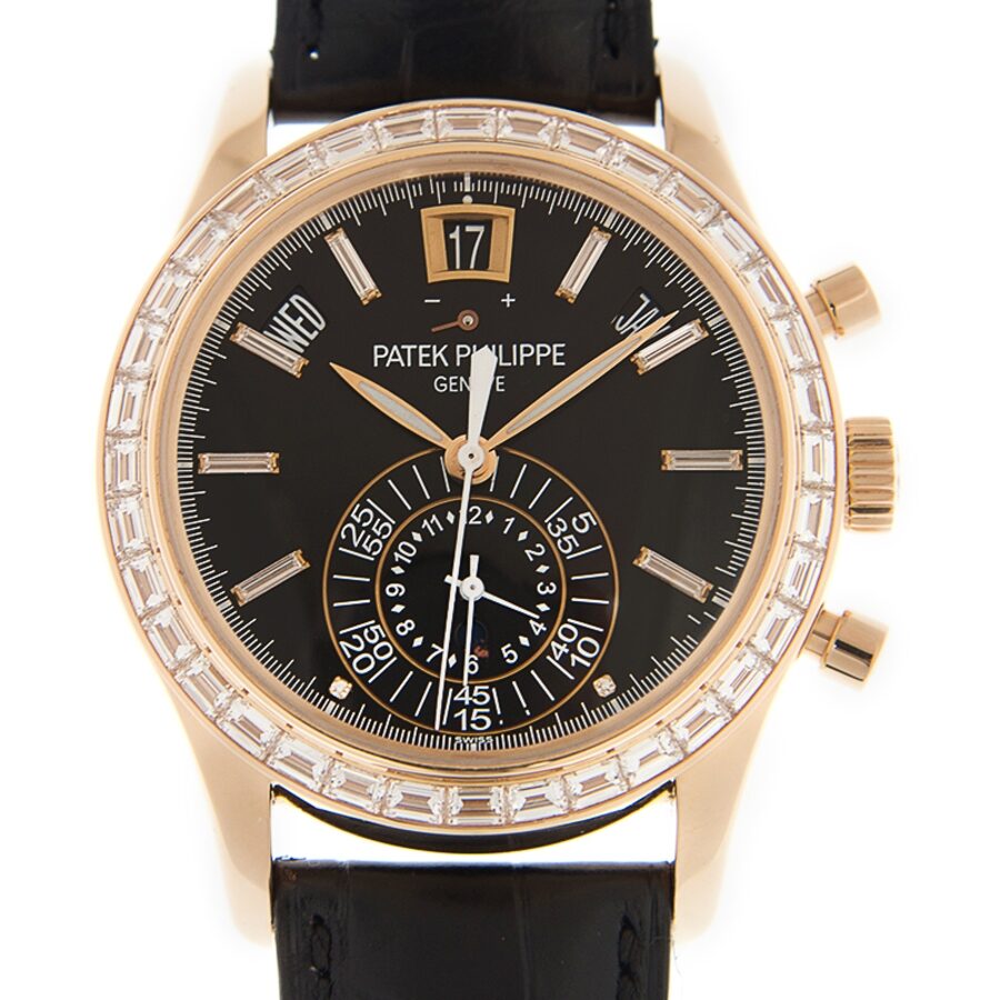 18kt rose gold case with a black alligator strap with square scales, hand-stitched, band. Fixed rose gold 36 baguette diamonds (~3.48 ct) bezel. Ebony black opaline dial with gold-tone leaf-style shape hands and 8 baguette diamond hour markers (~0.23 ct) hour markers. Minute markers around the outer rim. Dial Type: Analog. Luminescent hands. Annual calendar. Two sub-dials displaying: 60 minute/12 hour and power reserve indicator. Patek Philippe Calibre CH 28-520 IRM QA 24H Automatic movement, containing 40 Jewels, composed of 456 parts, bitting at 28800 vph, and has a power reserve of approximately 55 hours. Scratch resistant sapphire crystal. Transparent case back. Round case shape, case size: 40.5 mm. Fold-over with 22 baguette diamonds (~0.97 ct) clasp. Water resistant at 30 meters / 100 feet. Functions: annual calendar, chronograph, column wheel, flyback, month, date, day, hour, minute, second, power reserve indicator. Complications Series. Luxury watch style. Watch label: Swiss Made. Item Variations: 5961R 010, 5961R.010, 5961R010. Patek Philippe Complications Chronograph Annual Calendar Automatic Gold Diamond Men's Watch 5961R-010.