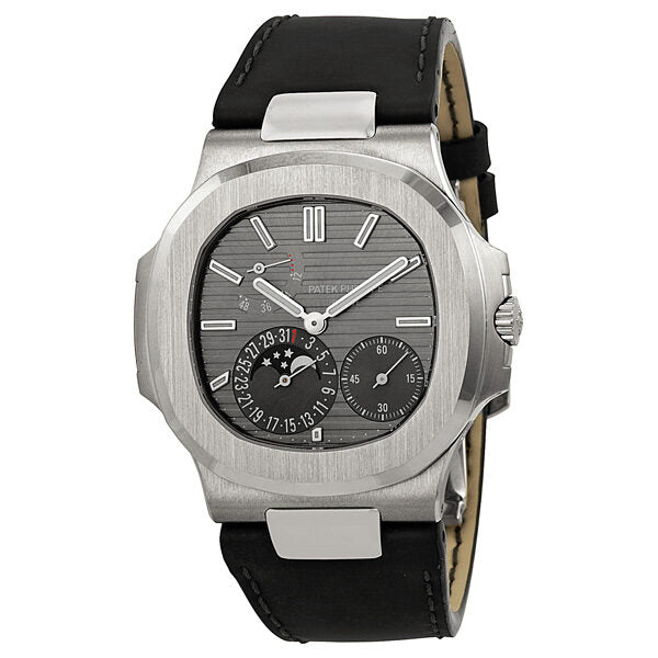 18kt white gold case with a black crocodile leather strap. Fixed 18kt white gold bezel. Slate grey dial with luminous hands and stick hour markers. Minute markers around the outer rim. Dial Type: Analog. Luminescent hands and markers. Date display at the 7 o'clock position. Three sub-dials displaying: small second, date/moonphase, power reserve indicator. Patek Philippe Calibre 240 PS IRM C LU Automatic movement, containing 29 Jewels, composed of 265 parts, bitting at 21600 vph, and has a power reserve of approximately 48 hours. Scratch resistant sapphire crystal. Screw down crown. Skeleton case back. Cushion case shape, case size: 40 mm x 38 mm. Band width: 21 mm. Fold over with safety release clasp. Water resistant at 60 meters / 200 feet. Functions: moon phase, date, hour, minute, small second, power reserve indicator. Nautilus Series. Luxury watch style. Watch label: Swiss Made. Patek Philippe Nautilus Automatic Moonphase Slate Grey Dial Men's Watch 5712G/001.