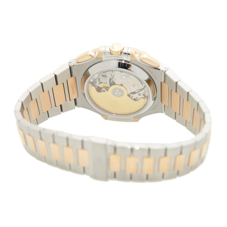 18kt rose gold case with a silver-tone 18kt rose gold and stainless steel bracelet. Fixed 18kt rose gold bezel. Blue dial with gold-tone hands and index hour markers. Minute markers around the outer rim. Dial Type: Analog. Luminescent hands and markers. Date display at the 3 o'clock position. One subdial displaying: 12 hour/60 minute. Patek Philippe Calibre CH 28-520 C Automatic movement, containing 35 Jewels, composed of 327 parts, bitting at 28800 vph, and has a power reserve of approximately 55 hours. Scratch resistant sapphire crystal. Screw down crown. Transparent case back. Cushion case shape, case size: 40.5 mm, case thickness: 12.2 mm. Butterfly clasp. Water resistant at 120 meters / 400 feet. Functions: chronograph, date, hour, minute, second. Additional Info: original box, international warranty card, manual (complete accessories). Nautilus Series. Luxury watch style. Watch label: Swiss Made. Patek Philippe Nautilus Chronograph Blue Dial Men's Watch 5980-1AR-001.