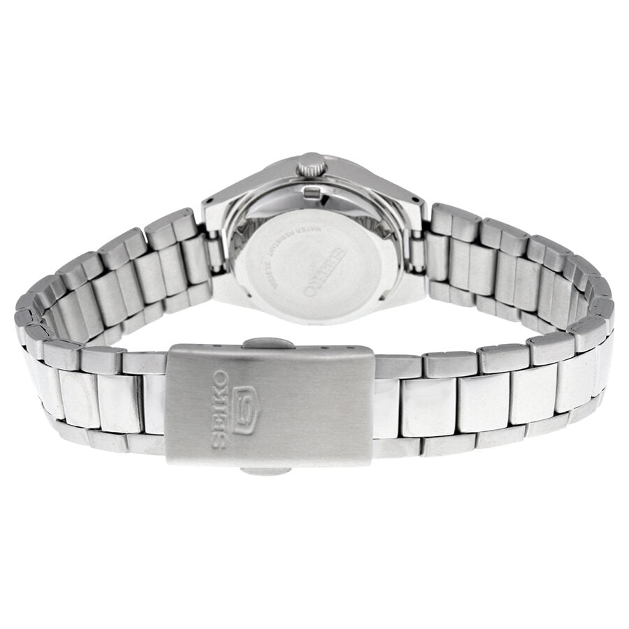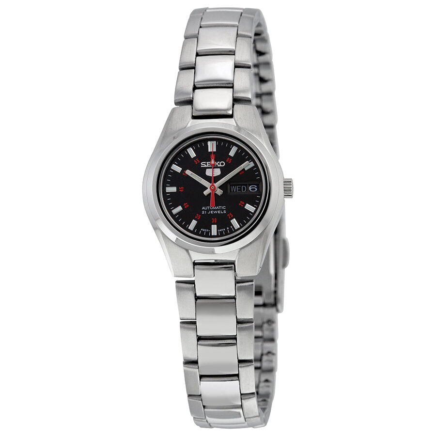 Stainless steel case with a stainless steel bracelet. Fixed stainless steel bezel. Black dial with luminous silver-tone hands and index hour markers. Minute markers around the outer rim. Dial Type: Analog. Luminescent hands and markers. Day of the week and date display at the 3 o'clock position. Automatic movement. Scratch resistant Hardlex crystal. Pull / push crown. Solid case back. Case diameter: 28 mm. Case thickness: 11 mm. Round case shape. Band width: 14.5 mm. Fold over clasp with a push button release. Water resistant at 30 meters / 100 feet. Functions: date, day, hour, minute, second. Additional Info: withstands rain and splashes of water, but not showering or submersion. Casual watch style. Seiko 5 Automatic Black Dial Stainless Steel Ladies Watch SYMC27.