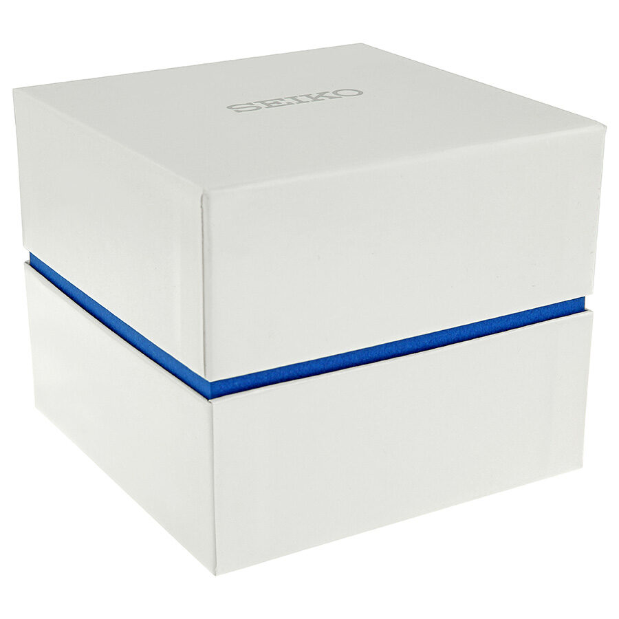 Stainless steel case with a stainless steel bracelet. Fixed smooth stainless steel bezel. Blue dial with luminous silver-tone arrow-shaped hands and index hour markers. Arabic numeral minute markers (at 5 minute intervals). Minute markers around the outer rim. Dial Type: Analog. Luminescent hands and markers. Day of the week and date display at the 3 o'clock position. Seiko caliber 7S26 automatic movement, based upon Seiko 7002, containing 21 Jewels, bitting at 21600 vph, and has a power reserve of approximately 40 hours. Scratch resistant Hardlex crystal. Pull / push crown. Skeleton case back. Round case shape. Case size: 38 mm. Case thickness: 12 mm. Band width: 20 mm. Fold over clasp. Water resistant at 30 meters / 100 feet. Functions: date, day, hour, minute, second. Sport Series. Sport watch style. Watch label: Japan Movt. Seiko 5 Blue Automatic Blue Dial Men's Watch SNKK27.