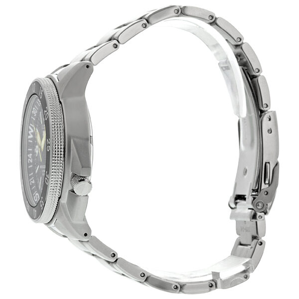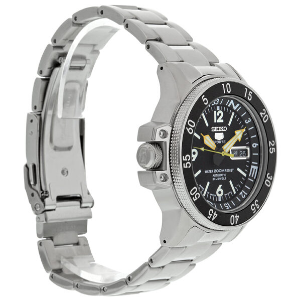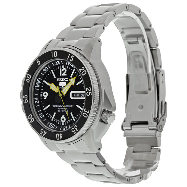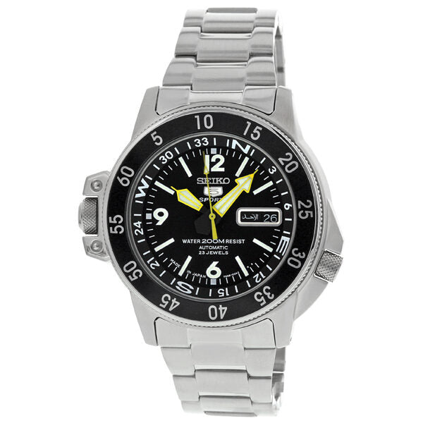Stainless steel case with a stainless steel bracelet. Uni-directional rotating stainless steel bezel with a black ring. Black dial with luminous arrow-shaped hands and index hour markers. Arabic numerals mark the 6, 9 and 12 o'clock positionss. Minute markers. Rotating compass ring. Dial Type: Analog. Luminescent hands and markers. Day of the week and date display at the 3 o'clock position. Seiko Caliber 7S36 automatic movement with a 40-hour power reserve. Scratch resistant Hardlex crystal. Solid case back. Round case shape. Case size: 42 mm. Case thickness: 14 mm. Band width: 22 mm. Fold over clasp with a safety release Water resistant at 200 meters / 660 feet. Functions: compass, date, hour, minute, second. Casual watch style. Watch label: Japan Movt. Seiko 5 Compass Automatic Black Dial Men's Watch SKZ211J1.
