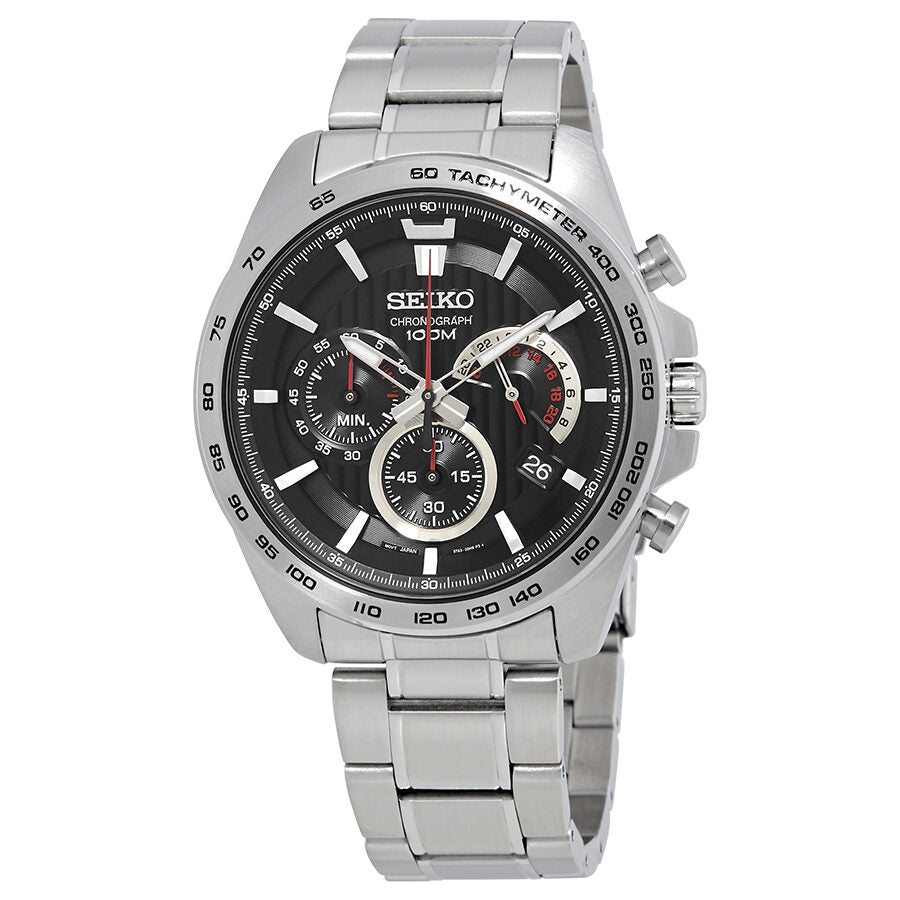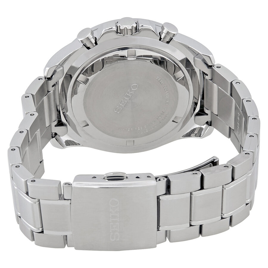 Stainless steel case with a stainless steel bracelet. Fixed stainless steel bezel displaying tachymeter markings. Black dial with luminous silver-tone hands and index hour markers. Minute markers around the outer rim. Dial Type: Analog. Luminescent hands. Date display at the 4 o'clock position. Chronograph - three sub-dials displaying: 60 second, 60 minute and 24 hours. Quartz movement. Scratch resistant Hardlex crystal. Pull / push crown. Solid case back. Round case shape. Case size: 44 mm. Case thickness: 13 mm. Band width: 22 mm. Fold over clasp with a push button release. Water resistant at 100 meters / 330 feet. Functions: chronograph, tachymeter, date, hour, minute, second. Casual watch style. Seiko Chronograph Black Dial Men's Watch SSB299P1.