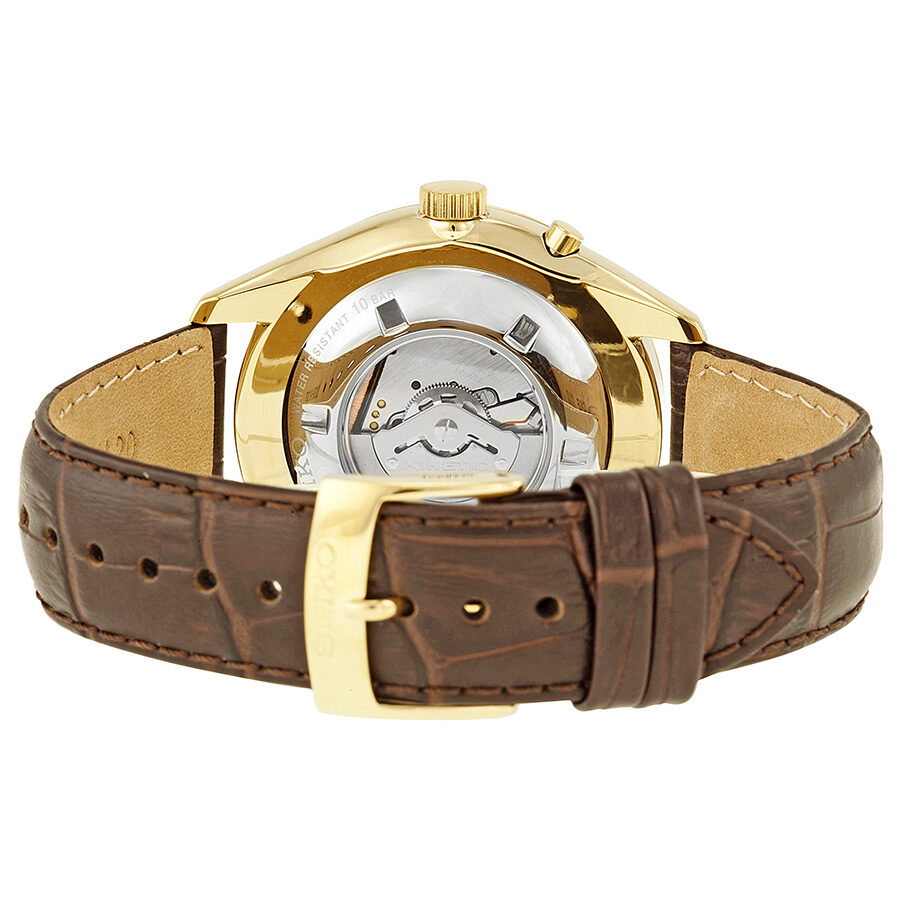 Yellow gold-tone stainless steel case with a brown leather strap. Fixed yellow gold-tone bezel. White dial with yellow gold-tone hands and Arabic numeral hour markers. Minute markers around the outer rim. Dial Type: Analog. Date display at the 3 o'clock position. Day of the week display at the 5 o'clock position. Seiko caliber 5M84 auto-quartz movement with a 6 months power reserve. Scratch resistant Hardlex crystal. Pull / push crown. Skeleton case back. Round case shape. Case size: 42 mm. Case thickness: 14 mm. Band width: 20 mm. Band length: 8 inches. Tang clasp. Water resistant at 100 meters / 330 feet. Functions: date, day, hour, minute, second. Casual watch style. Watch label: Japan Movt. Seiko Kinetic White Dial Brown Leather Men's Watch SRN052.