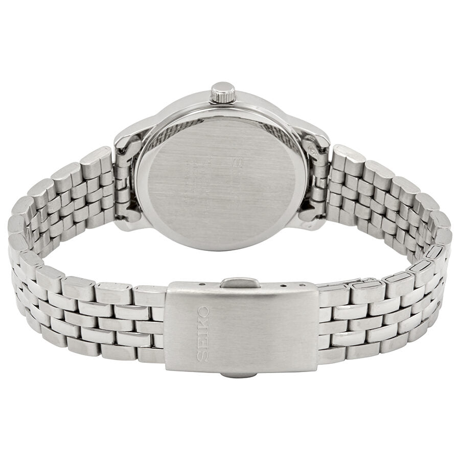 Stainless steel case with a stainless steel bracelet. Fixed stainless steel bezel. Blue dial with silver-tone hands and index hour markers. Minute markers around the outer rim. Dial Type: Analog. Date display at the 3 o'clock position. Seiko caliber 6N22 quartz movement. Scratch resistant Hardlex crystal. Push / pull crown. Solid case back. Round case shape. Case size: 30 mm. Case thickness: 7 mm. Deployment clasp. Water resistant at 50 meters / 165 feet. Functions: date, hour, minute, second. Casual watch style. Watch label: Japan Movt. Seiko Neo Classic Blue Dial Ladies Watch SUR665P1.