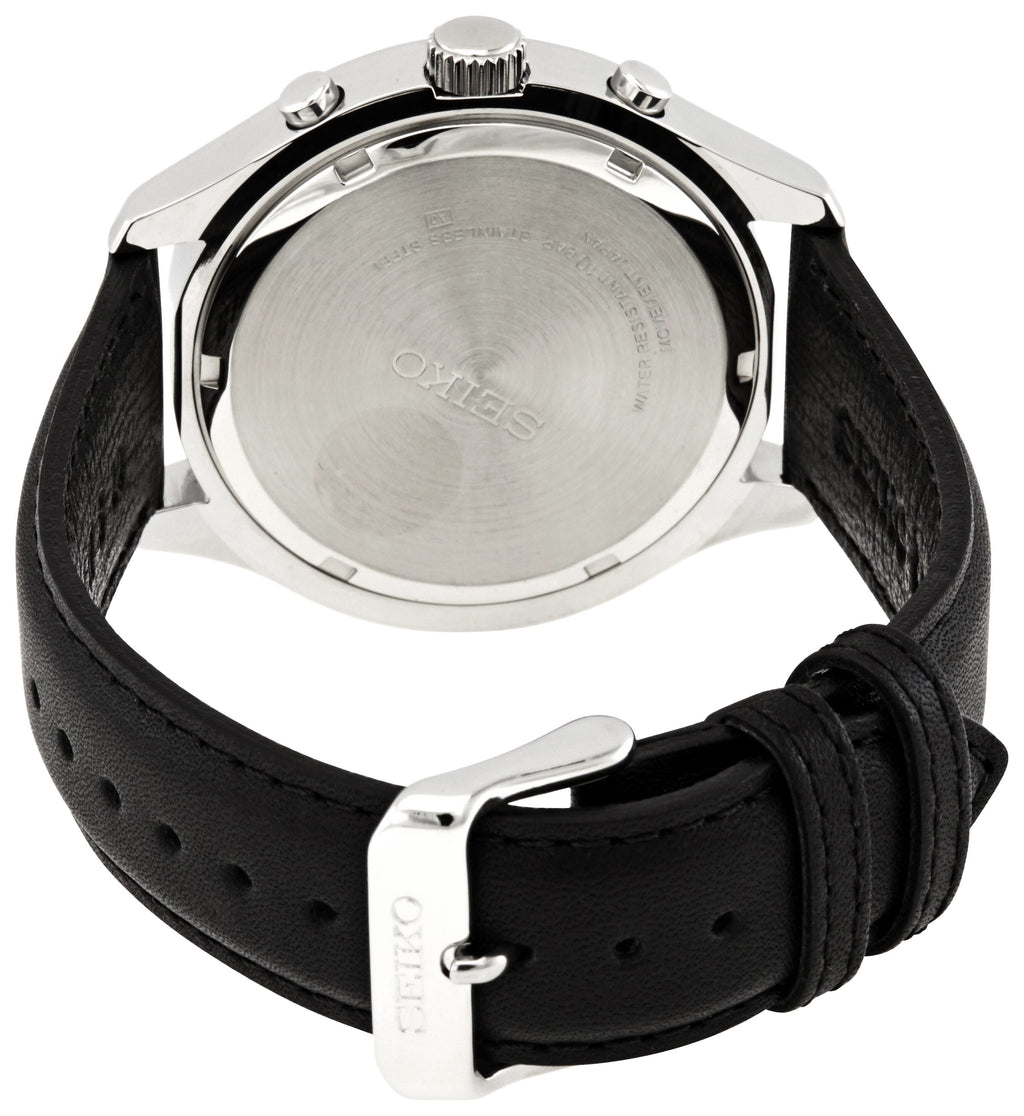 Stainless steel case with a black leather strap. Fixed stainless steel bezel. Black dial with silver-tone skeleton hands and index hour markers. Minute markers. Dial Type: Analog. Date display at the 3 o'clock position. Chronograph - three sub-dials displaying: 60 minutes, 60 seconds and 1/110th of a second. Quartz movement. Scratch resistant mineral crystal. Pull / push crown. Solid case back. Round case shape. Case size: 43 mm. Case thickness: 12 mm. Band width: 20 mm. Tang clasp. Water resistant at 100 meters / 330 feet. Functions: chronograph, hour, minute, second, date. Casual watch style. Watch label: Japan Movt. Seiko Neo Sports Chronograph Quartz Black Dial Men's Watch SKS539P2.