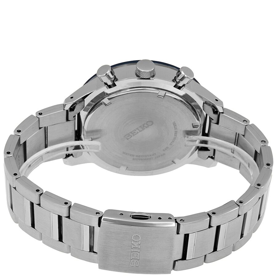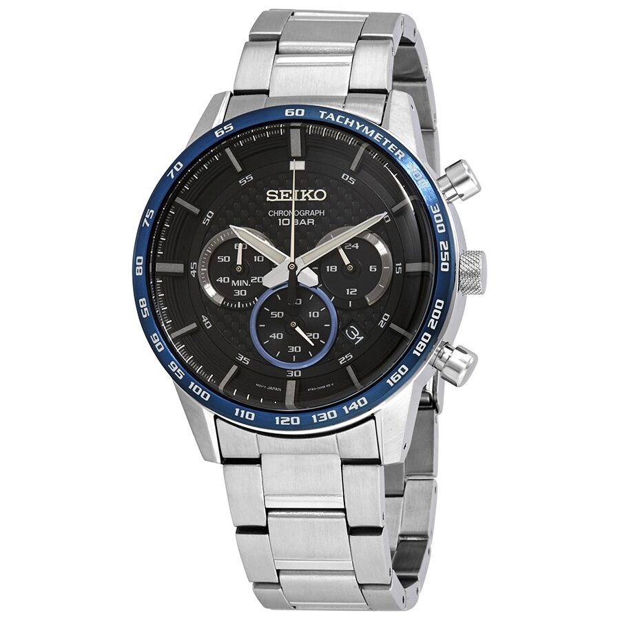 Stainless steel case with a stainless steel bracelet. Fixed stainless steel bezel with a blue ion-plated ring showing tachymeter markings. Black dial with luminous silver-tone dauphine-style hands and index hour markers. Minute markers around the outer rim. Dial Type: Analog. Luminescent hands. Date display between the 4 and 5 o'clock positions. Chronograph - three sub-dials displaying: 60 second, 60 minute and 24 hour. Seiko caliber 8T63 quartz movement. Scratch resistant Hardlex crystal. Solid case back. Round case shape. Case size: 45 mm. Case thickness: 14 mm. Band width: 22 mm. Fold over clasp with a safety release. Water resistant at 100 meters / 330 feet. Functions: chronograph, tachymeter, hour, minute, second, date. Neo Sports Series. Sport watch style. Watch label: Japan Movt. Seiko Neo Sports Chronograph Quartz Black Dial Men's Watch SSB357.
