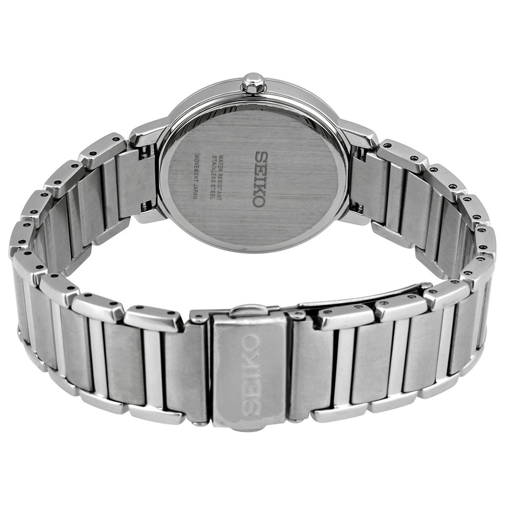 Stainless steel case with a stainless steel bracelet. Fixed stainless steelbezel set with Swarovski crystals. Blue dial with silver-tone hands and pyramid hour markers. Dial Type: Analog. Caliber V115 quartz movement. Scratch resistant curved Hardlex crystal. Pull / push crown. Solid case back. Round case shape. Case size: 30 mm. Case thickness: 6.9 mm. Band width: 12 mm. Fold over clasp with a push button release. Water resistant at splash resistant. Functions: hour, minute. Casual watch style. Watch label: Japan Movt. Seiko Quartz Blue Dial Stainless Steel Ladies Watch SUP433P1.