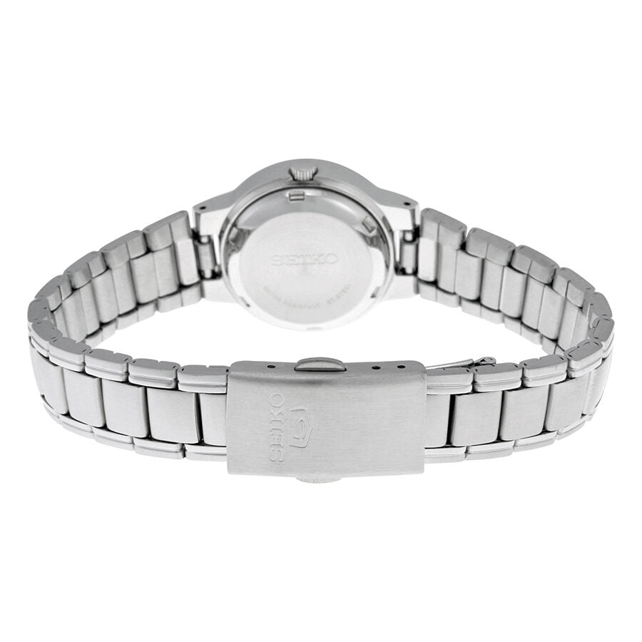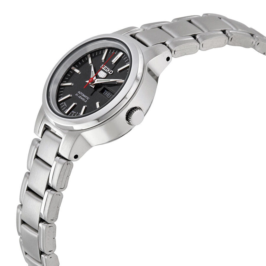 Stainless steel case with a stainless steel bracelet. Fixed stainless steel bezel. Black dial with luminous silver-tone hands and index hour markers. Minute markers around the outer rim. Dial Type: Analog. Luminescent hands and markers. Day of the week and date display at the 3 o'clock position. Seiko caliber 4207 automatic movement, containing 21 Jewels, bitting at 21600 vph, and has a power reserve of approximately 24 hours. Scratch resistant Hardlex crystal. Pull / push crown. Solid case back. Round case shape. Case size: 25 mm. Case thickness: 10 mm. Band width: 14 mm. Deployment clasp. Water resistant at 30 meters / 100 feet. Functions: date, day, hour, minute, second. Additional Info: withstands rain and splashes of water, but not showering or submersion. Casual watch style. Seiko Series 5 Automatic Black Dial Ladies Watch SYME43.
