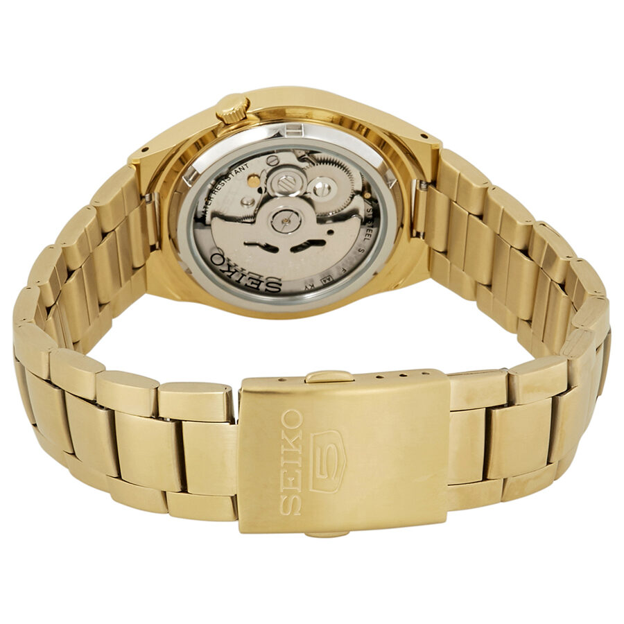 Gold-tone stainless steel case and bracelet. Fixed gold-tone bezel. Gold dial with luminous gold-tone hands and index hour markers. Minute markers around the outer rim. Dial Type: Analog. Luminescent hands and markers. Day of the week and date display at the 3 o'clock position. Seiko caliber 7S26 automatic movement with a 40-hour power reserve. Scratch resistant Hardlex crystal. Pull / push crown. Transparent case back. Round case shape. Case size: 38 mm. Case thickness: 11 mm. Band width: 20 mm. Fold over clasp with a safety release. Water resistant at 30 meters / 100 feet. Functions: date, day, hour, minute, second. Casual watch style. Seiko Series 5 Automatic Gold Dial Men's Watch SNK610.