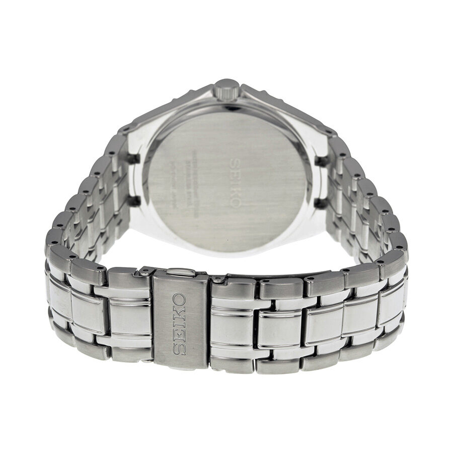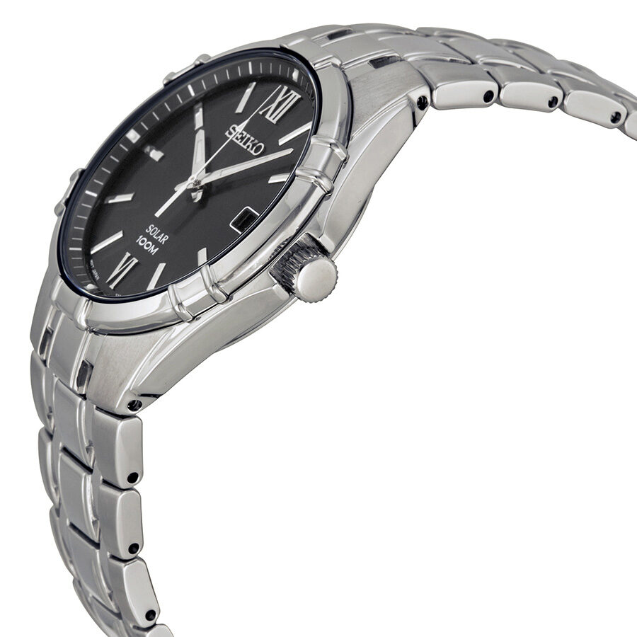 Stainless steel case with a stainless steel bracelet. Fixed stainless steel bezel. Black dial with luminous silver-tone hands and index hour markers. Roman numerals mark the 6 and 12 o'clock positions. Minute markers around the outer rim. Dial Type: Analog. Luminescent hands and markers. Date display at the 3 o'clock position. Seiko caliber V157 solar quartz movement. Scratch resistant Hardlex crystal. Solid case back. Round case shape. Case size: 38 mm. Case thickness: 9 mm. Band width: 21 mm. Deployment clasp. Water resistant at 100 meters / 330 feet. Functions: date, hour, minute, second, solar-powered. Additional Info: in general, suitable for swimming and snorkeling, but not scuba diving. Casual watch style. Watch label: Japan Movt. Seiko Solar Black Dial Men's Watch SNE215.