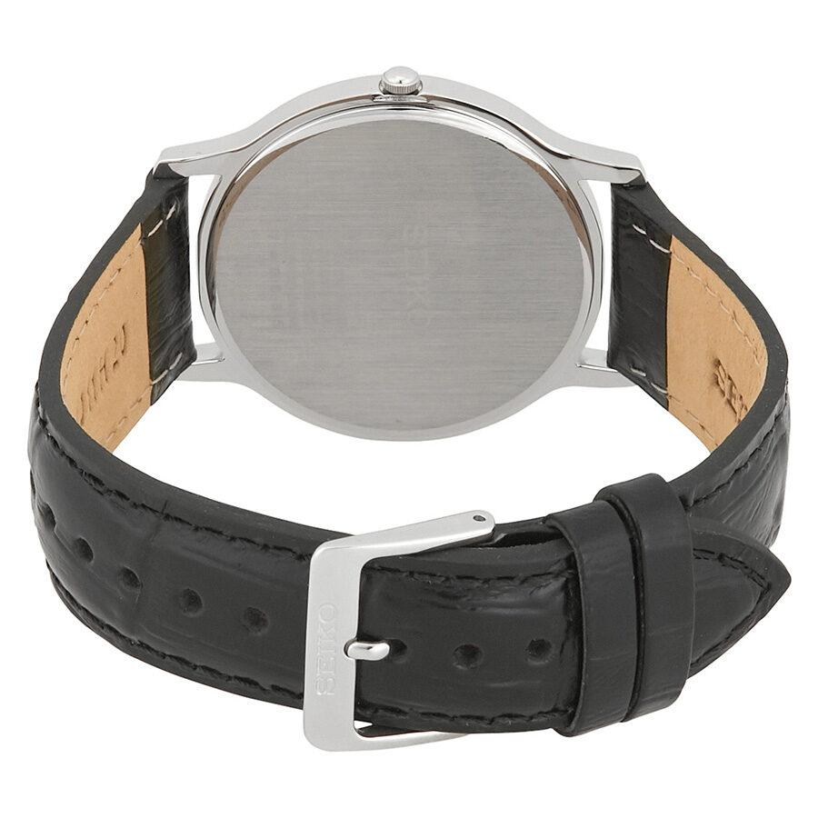 Stainless steel case with a black leather strap. Fixed stainless steel bezel. Blue dial with silver-tone hands and Arabic numeral hour markers. Minute markers around the outer rim. Dial Type: Analog. Seiko caliber V115 quartz movement. Scratch resistant Hardlex crystal. Pull / push crown. Solid case back. Round case shape. Case size: 37.8 mm. Case thickness: 6.2 mm. Band width: 20 mm. Tang clasp. Water resistant at 30 meters / 100 feet. Functions: hour, minute, solar-powered. Casual watch style. Watch label: Japan Movt. Seiko Solar Blue Dial Men's Watch SUP861.