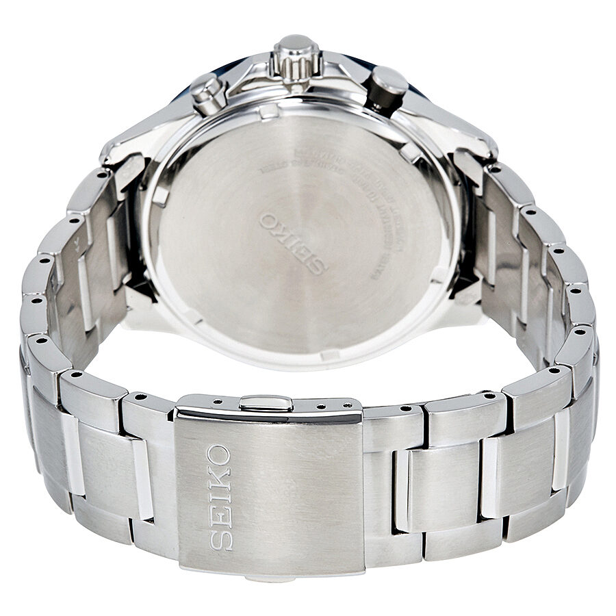 Stainless steel case with a stainless steel bracelet. Fixed blue-plated bezel. Blue dial with luminous silver-tone hands and index hour markers. Minute markers. Tachymeter markings around the outer rim. Dial Type: Analog. Luminescent hands and markers. Date display between the 4 and 5 o'clock positions. Chronograph - three sub-dials displaying: 60 second, 60 minute and 24 hour. Seiko caliber V175 quartz movement. Scratch resistant Hardlex crystal. Solid case back. Round case shape. Case size: 45 mm. Case thickness: 12 mm. Band width: 22 mm. Deployment clasp. Water resistant at 100 meters / 330 feet. Functions: chronograph, tachymeter, date, hour, minute, second, solar-powered. Sport watch style. Watch label: Japan Movt. Seiko Solar Chronograph Blue Dial Men's Watch SSC495.