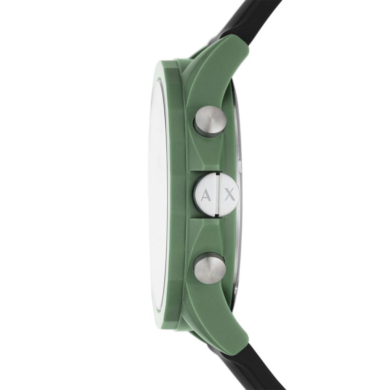 Green rubber case with a black silicone strap. Fixed green rubber bezel. Black and orange dial with silver-tone hands and index hour markers. Arabic numeral minute markers (at 5 minute intervals). Minute markers around the outer rim. Dial Type: Analog. Date display between the 4 and 5 o'clock positions. Chronograph - three sub-dials displaying: 60 second, 30 minute and 12-24 hours. Quartz movement. Scratch resistant mineral crystal. Pull / push crown. Solid case back. Round case shape. Case size: 44 mm. Case thickness: 12 mm. Band width: 22 mm. Tang clasp. Water resistant at 30 meters / 100 feet. Functions: chronograph, date, hour, minute, second. Outerbanks Series. Casual watch style. Armani Exchange Outerbanks Chronograph Quartz Black Dial Men's Watch AX1348.