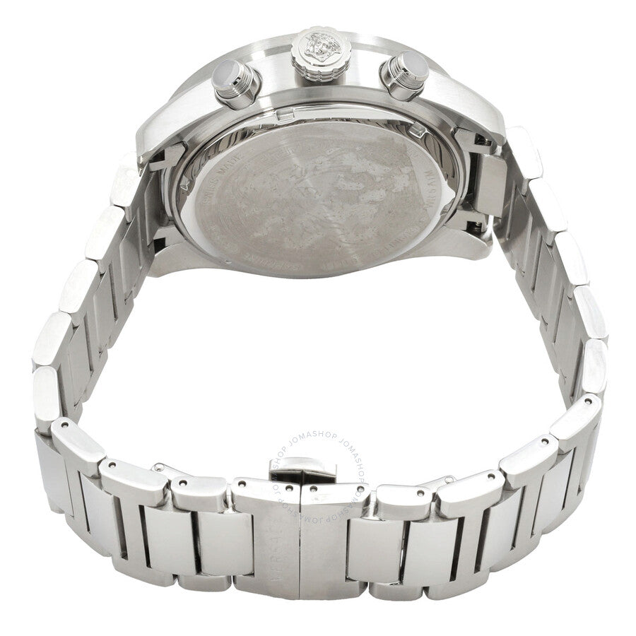 Silver-tone stainless steel case and bracelet. Fixed black stainless steel bezel. Blue dial with silver-tone hands and batons hour markers. Minute scale around the inner rim. Dial Type: Analog. Luminescent hands and markers. Date display at the 4 o'clock position. Chronograph - three sub-dials displaying: 60 second, 60 minute and 1/10th of a second. Quartz movement. Scratch resistant sapphire crystal. Pull / push crown. Solid case back. Round case shape, case size: 43 mm, case thickness: 13 mm. Band width: 22 mm. Deployment with push button release clasp. Water resistant at 50 meters / 165 feet. Functions: chronograph, hour, minute, second. Greca Dome Series. Dress watch style. Watch label: Swiss Made. Versace Greca Dome Chronograph Quartz Blue Dial Men's Watch VE6K00323.