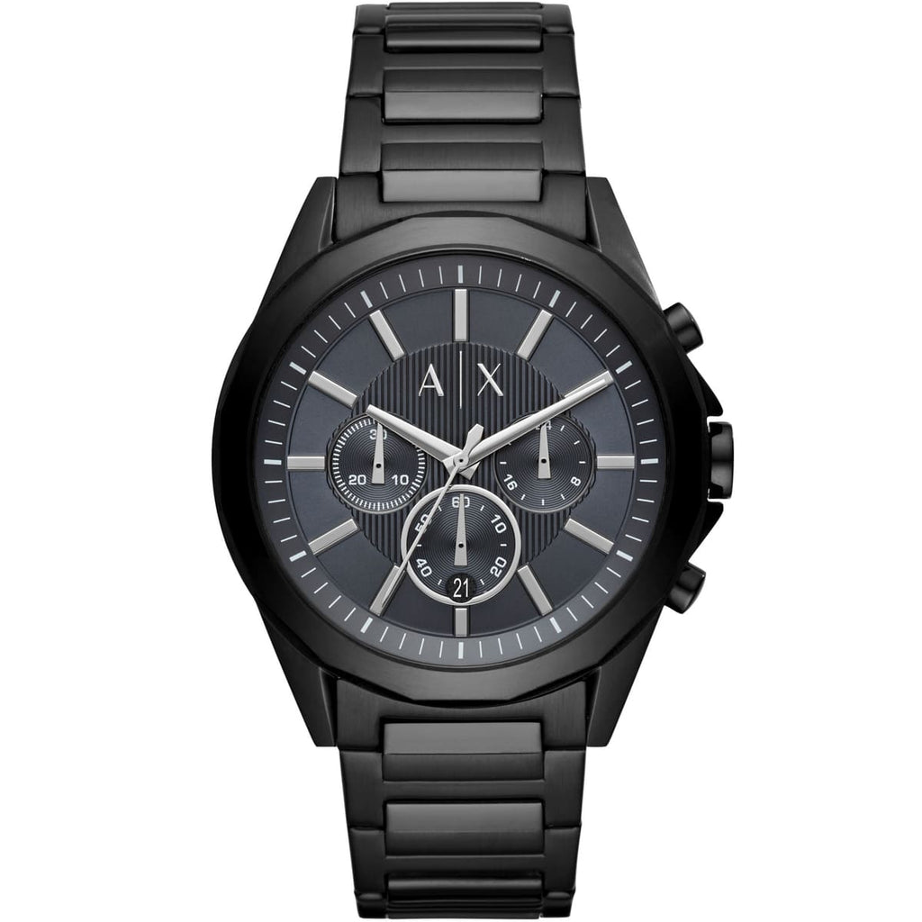 An Armani Exchange AX2639 Drexler watch for men, with a 44mm round black stainless steel case, a black dial, and a black band. This watch is powered by a quartz movement.