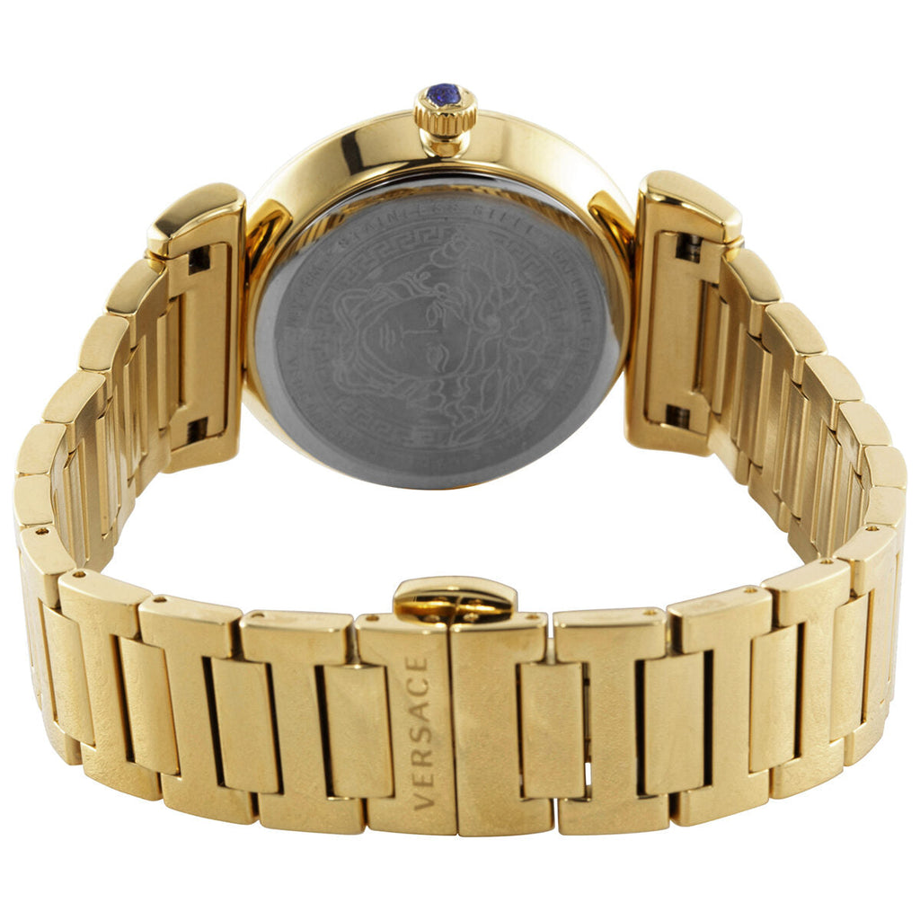 Yellow gold ion-plated stainless steel case and bracelet. Fixed yellow gold ion-plated bezel. Gold dial with gold-tone hands and dot hour markers. Inverse 'V' markers at the 3, 6 and 9 o'clock positions. The Medusa Head appears at the 12 o'clock positions. Dial Type: Analog. Quartz movement. Scratch resistant sapphire crystal. Pull / push crown. Solid case back. Round case shape. Case size: 35 mm. Case thickness: 8 mm. Band width: 18 mm. Deployment clasp. Water resistant at 50 meters / 165 feet. Functions: hour, minute. V-motif Series. Casual watch style. Watch label: Swiss Made. Versace V-Motif Quartz Gold Dial Ladies Watch VERE00618.