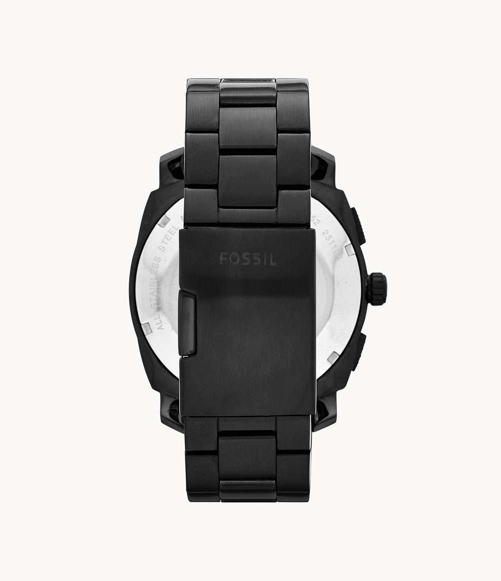 Black stainless steel case and bracelet. Fixed black stainless steel bezel. Black dial with black hands and index hour markers. Minute markers around the outer rim. Dial Type: Analog. Luminescent hands and markers. Date display between 4 and 5 o'clock position. Chronograph - three sub-dials displaying: 60 second, 60 minute and 24 hour. Quartz movement. Scratch resistant mineral crystal. Pull / push crown. Solid case back. Round case shape, case size: 45 mm, case thickness: 11 mm. Band width: 24 mm, band length: 8 inches. Deployant clasp. Water resistant at 50 meters / 165 feet. Functions: chronograph, date, hour, minute, second. Machine Series. Casual watch style. Fossil Machine Chronograph Quartz Black Dial Men's Watch FS4552IE.