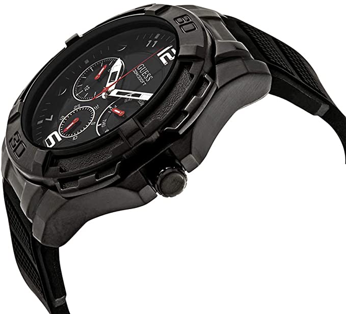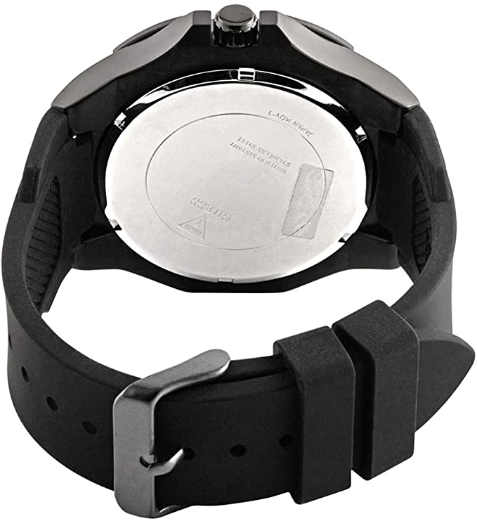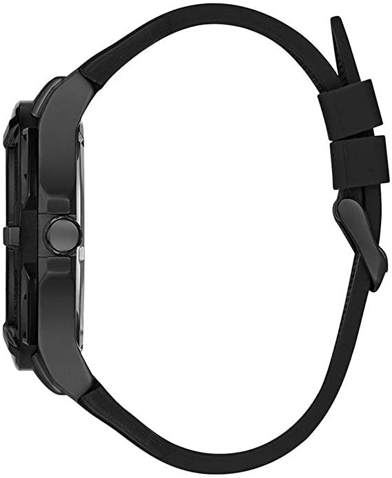 Black ion-plated stainless steel case with a black silicone strap. Fixed black ion-plated bezel. Black dial with luminous silver-tone hands and index hour markers. Minute markers around the outer rim. Dial Type: Analog. Luminescent hands and markers. Three multi-function sub-dials displaying: 24 hours, date and day of the week. Quartz movement. Scratch resistant mineral crystal. Pull / push crown. Solid case back. Round case shape. Case size: 52 mm. Case thickness: 14 mm. Band width: 22 mm. Tang clasp. Water resistant at 100 meters / 330 feet. Functions: date, day, hour, minute, second. Sport watch style. Guess Genesis Quartz Black Dial Men's Watch W1254G2.