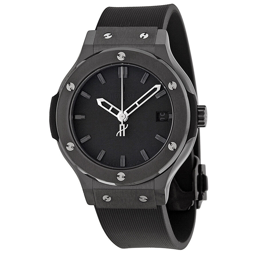 Black ceramic case with a black rubber strap. Fixed black ceramic bezel. Black dial with silver-tone skeleton hands and index hour markers. Dial Type: Analog. Date display at the 3 o'clock position. Quartz movement. Caliber hub 2910 engine. Scratch resistant sapphire crystal. Pull / push crown. Solid case back. Case diameter: 38 mm. Round case shape. Deployment with push button clasp. Water resistant at 100 meters / 330 feet. Functions: date, hour, minute, second. Casual watch style. Watch label: Swiss Made. Hublot Classic Fusion Black Dial Rubber Strap Men's Watch 561.CM.1110.RX.