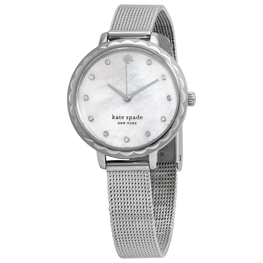 Stainless steel case with a stainless steel mesh bracelet. Fixed stainless steel bezel. Mother of pearl dial with silver-tone hands and crystal hour markers. The Kate Spade logo appears at the 12 o'clock position. Dial Type: Analog. Quartz movement. Scratch resistant mineral crystal. Pull / push crown. Solid case back. Round case shape. Case size: 28 mm. Case thickness: 6 mm. Band width: 10 mm. Fold over slip through clasp. Water resistant at 30 meters / 100 feet. Functions: hour, minute, second. Morningside Series. Casual watch style. Kate Spade Morningside Quartz Crystal Watch KSW1573.