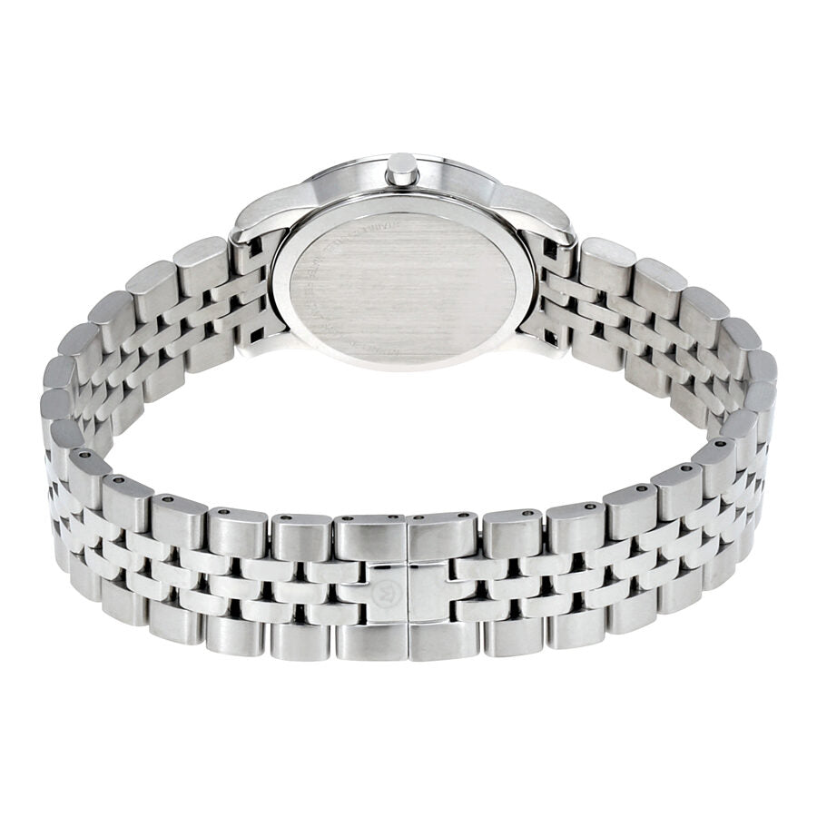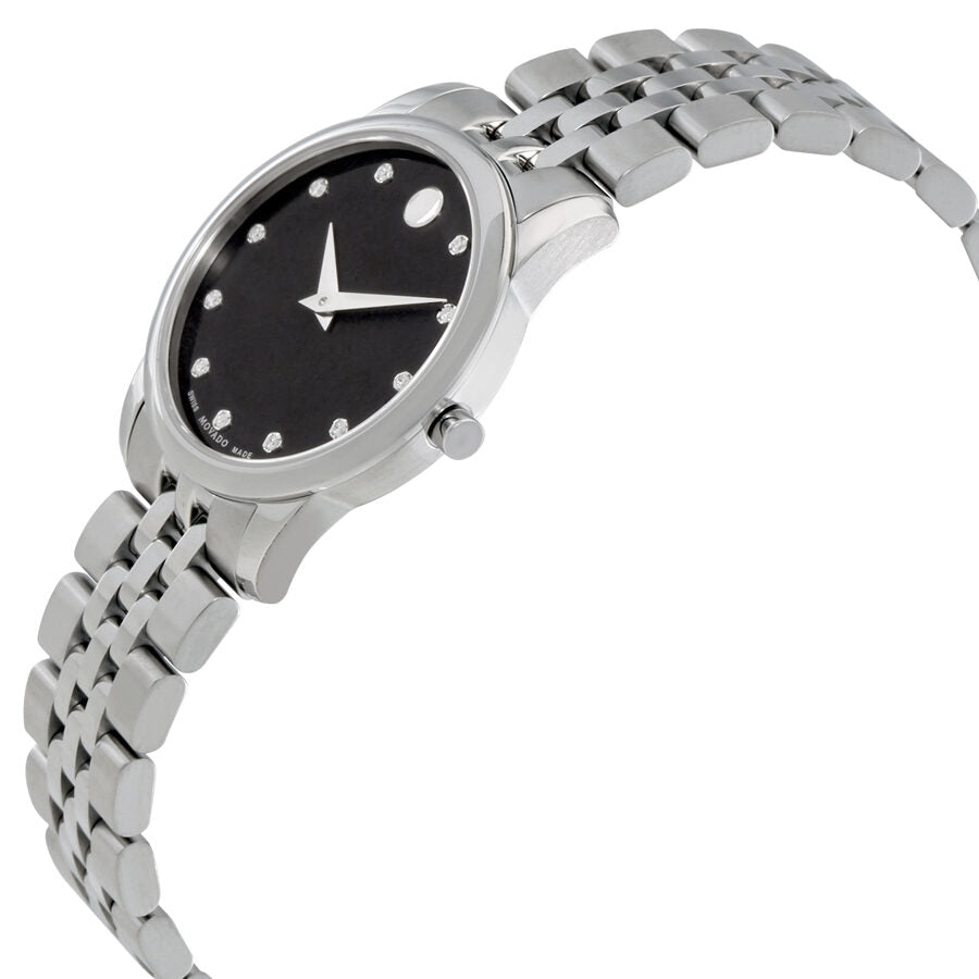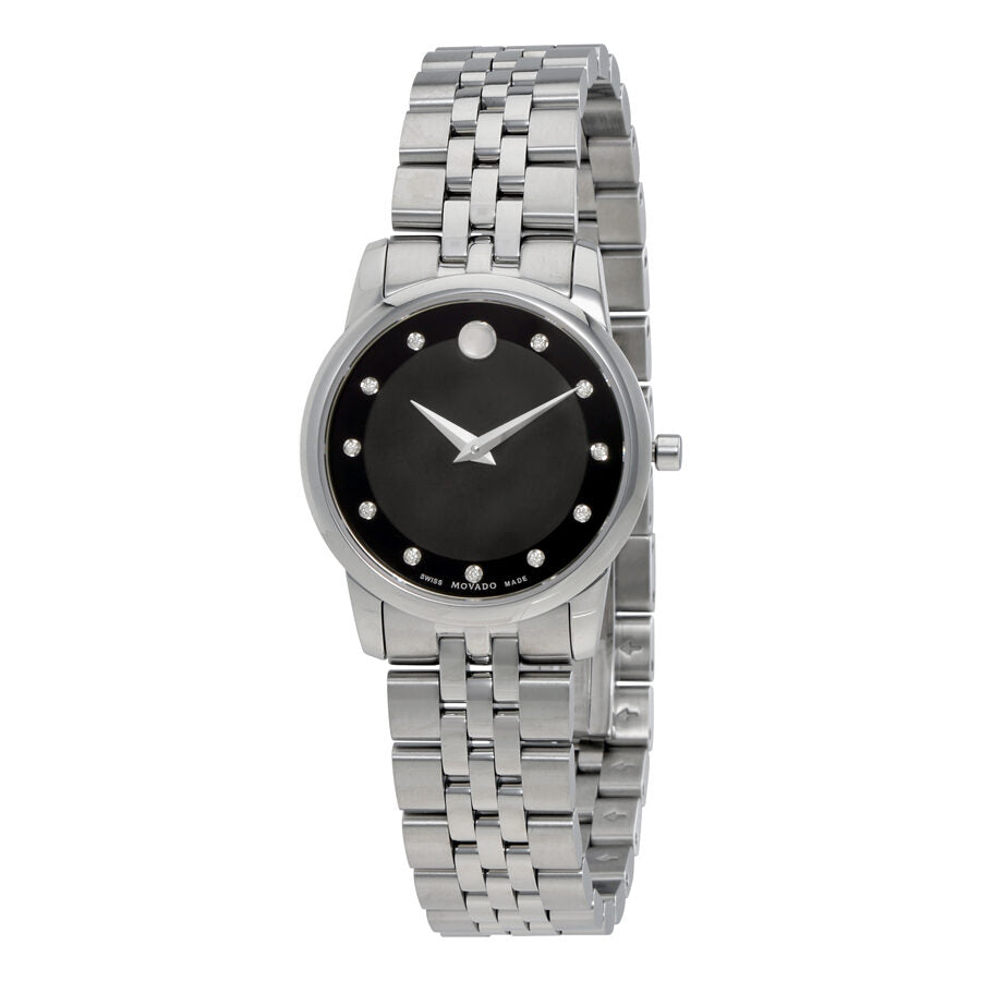 Caja de acero inoxidable con un brazalete de acero inoxidable. Bisel fijo de acero inoxidable. Esfera negra con manecillas plateadas y marcadores de hora de diamantes. El punto Movado marca la posición de las 12 en punto. Tipo de esfera: analógica. Movimiento de cuarzo. Cristal de zafiro resistente a los arañazos. Tirar/empujar la corona. Parte trasera sólida. Diámetro de la caja: 28 mm. Forma de caja redonda. Cierre desplegable. Resistente al agua a 30 metros / 100 pies. Funciones: hora, minuto. Estilo de reloj informal. Etiqueta del reloj: Swiss Made. Movado Museum cuarzo negro esfera plata acero inoxidable señoras reloj 0606858.