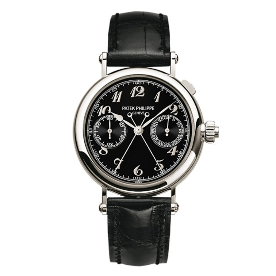 Patek Philippe Platinum Monopusher Split Seconds Chrono Ref. 5959, con doble sellado y sin usar. Caja de platino blanco con correa de piel de cocodrilo negra. Bisel fijo de platino en tono plateado. Esfera negra con manecillas plateadas y marcadores de hora con números arábigos. Marcadores de minutos alrededor del borde exterior. Tipo de esfera: analógica. Cronógrafo: dos subesferas que muestran: 60 segundos y 60 minutos. Patek Philippe Calibre CHR 27-525 PS Movimiento de cuerda manual, que contiene 27 joyas, compuesto de 252 partes, muerde a 21600 vph y tiene una reserva de marcha de aproximadamente 48 horas. Cristal de zafiro resistente a los arañazos. Fondo de caja transparente. Forma de caja redonda. Tamaño de la caja: 33 mm. Ancho de banda: 16 mm. Resistente al agua a 30 metros / 100 pies. Funciones: cronógrafo, rueda de pilares, rattrapante, horas, minutos, segundero pequeño. Estilo de reloj de lujo. Etiqueta del reloj: Swiss Made. Patek Philippe Chronograph Chronograph Reloj para hombre con esfera negra 5959P-011.